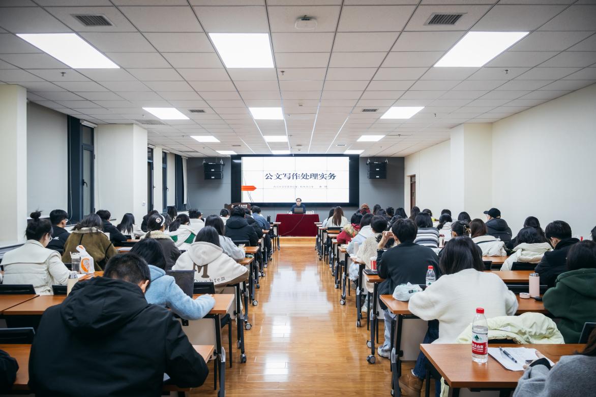 讲座中,唐明为学员们介绍了十五种法定公文的定义并作对比,通过生动详实的案例引导学生了解法定公文具体情况。唐明表示,公文写作是一项极其重要的工作,与学生所学专业知识密不可分,提前掌握公文写作能力对自身专业素养和未来就业能力提升都有显著帮助。