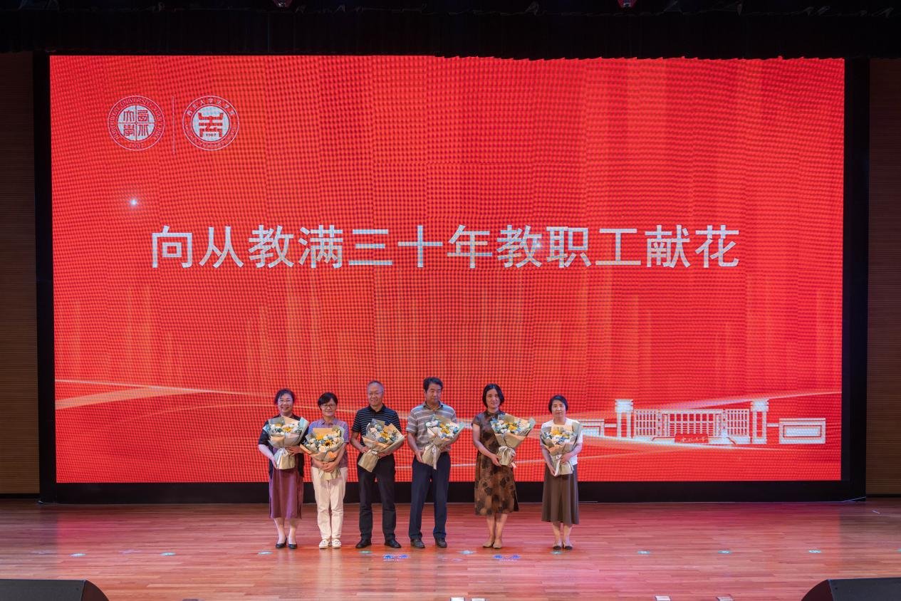 (向从教满三十年教职工献花)