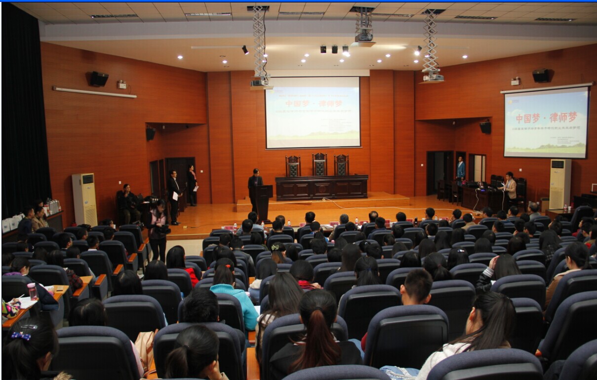 “中国梦、律师梦—《说法时间》进高校”活动拟走进十至二十所具有较大影响力的高校校园巡回演讲,旨在响应十八届四中全会的决定,并从法律的视角和形式对习近平总书记“中国梦”进行深入解读和宣传。我校作为本次活动的第一站,通过优秀律师的精彩演讲,引导广大学生通过对律师事务所企业文化、优秀律师成长史的了解,能够准确定位自己的人生目标,并努力实现自己的人生理想。