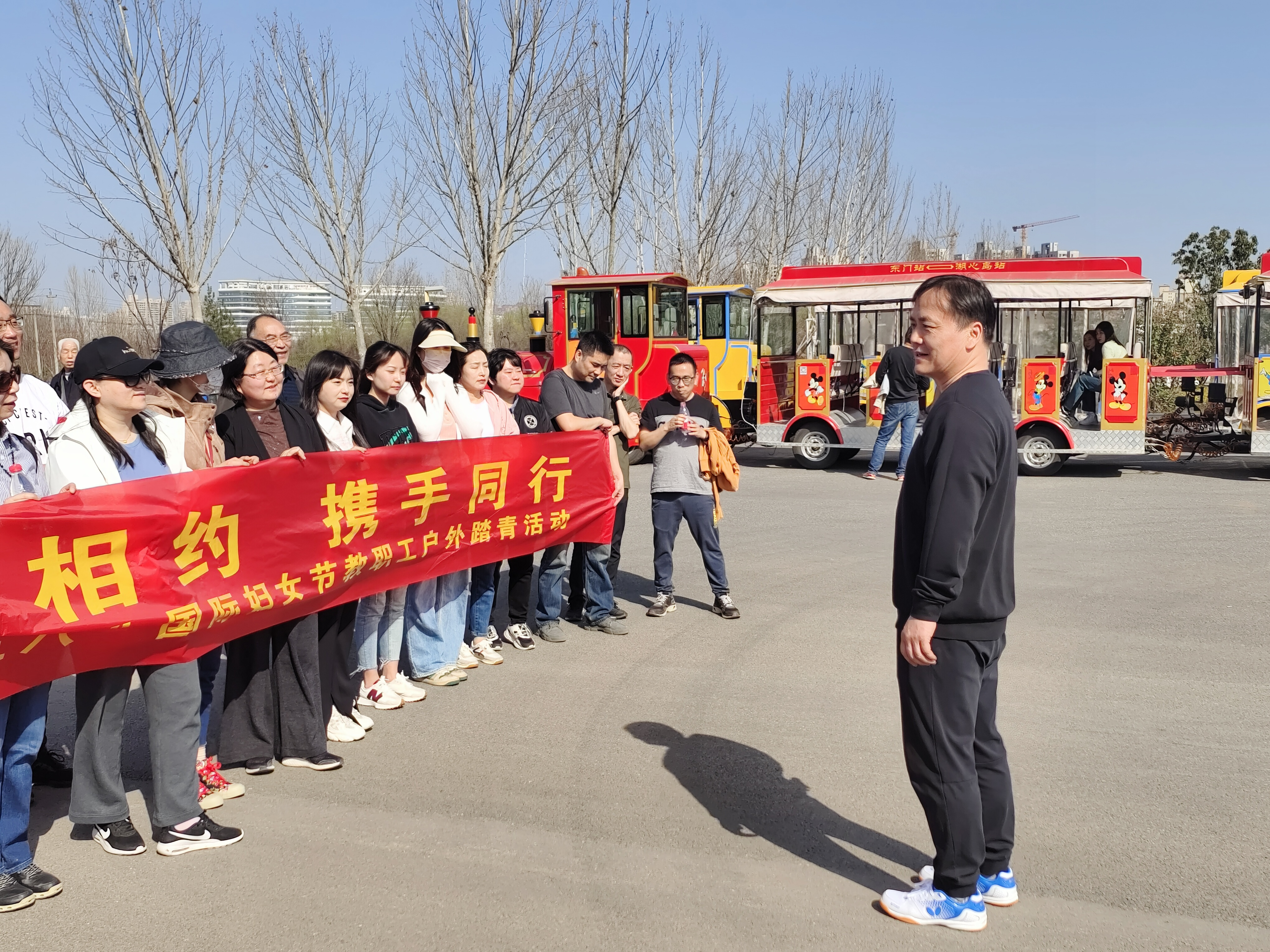38日下午3点,天气晴朗,阳光明媚,空气中弥漫着幸福的气息和春天的味道,我校全院教职工在长安公园蔷薇园集合。首先由李一凡书记作活动前动员发言,李书记表达了对于全院女员工的节日祝福,并鼓励大家多多参与学院工会组织的各式各样活动,在教学科研工作之余,注重身心健康的调整。