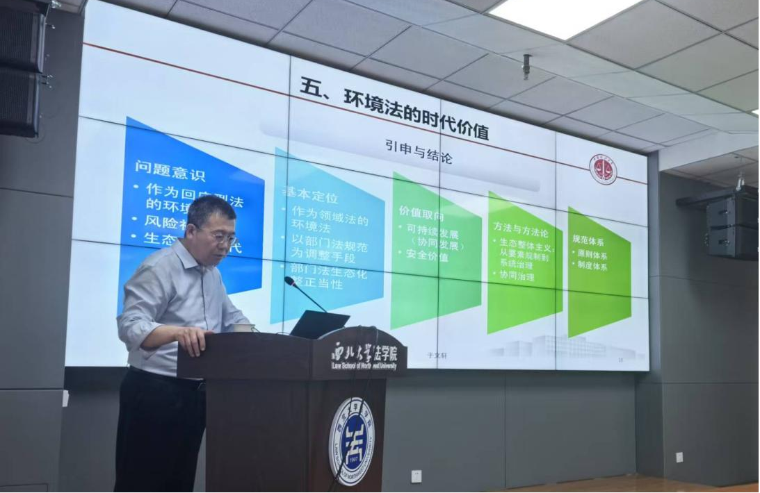 于文轩教授首先结合自身对环境法从初步接触到深入研究的历程,引出环境法究竟是部门法还是领域法,其内涵、范围以及与其他法律的关系等诸多问题,引发了师生们的思考。随后,于文轩教授从系统整体观、风险预防、生态安全、协同治理四个方面探讨了环境法的特质。他指出,环境法具有系统整体观,生态环境应当被视为一个有机整体,这与传统法部门有所不同。现代环境问题源于社会化大生产,以往的分要素治理模式存在局限性,新时代需以系统整体观进行生态环境治理,我国自然保护地体系建设就是典型例证。同时,环境法呈现出从损害预防到风险预防的趋势,在特定领域应当适用更严格的风险预防原则,以防范生态风险、环境健康法学和社会风险三大风险。环境法还强调安全价值,生态安全是国家安全的重要组成部分,与资源安全、核安全等密切相关,且安全价值与效率价值存在一定张力,需要兼顾与衡平。此外,协同治理也是环境法的重要特质,涵盖理念、体制、实施和制度等方面,黄河保护法中多层面的协同发展规定便是其有力体现。