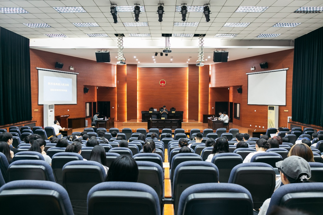 为了使学生直观感受到法律逻辑的严密与司法程序的公正,将理论知识与实践场景深度融合,2025年7月10日上午,我院与陕西省高级人民法院国际商事巡回审判庭联合举办“庭审进校园”活动。陕西省高级人民法院国际商事巡回审判庭在我校长安校区模拟法庭公开开庭审理上诉人A航运公司与被上诉人B商务信息咨询有限公司合同纠纷一案。通过旁听真实庭审,让同学们“沉浸式”感受国际商事案件审理的全过程。我院副院长崔玲玲、团委书记杨霁明、国际法教研部教师杨希及近二百名学生参加了此次活动。