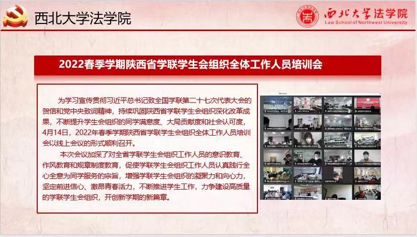 4月14日,2022年春季学期陕西省学联学生会组织全体工作人员培训会以线上会议的形式顺利召开。17日会议,我院组织学习工作会议意识教育、作风教育和规章制度教育,践行全心全意为同学服务的宗旨,建设更高质量的学联学生会组织。