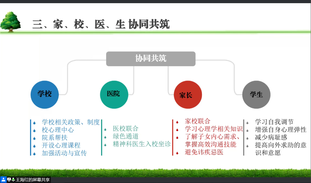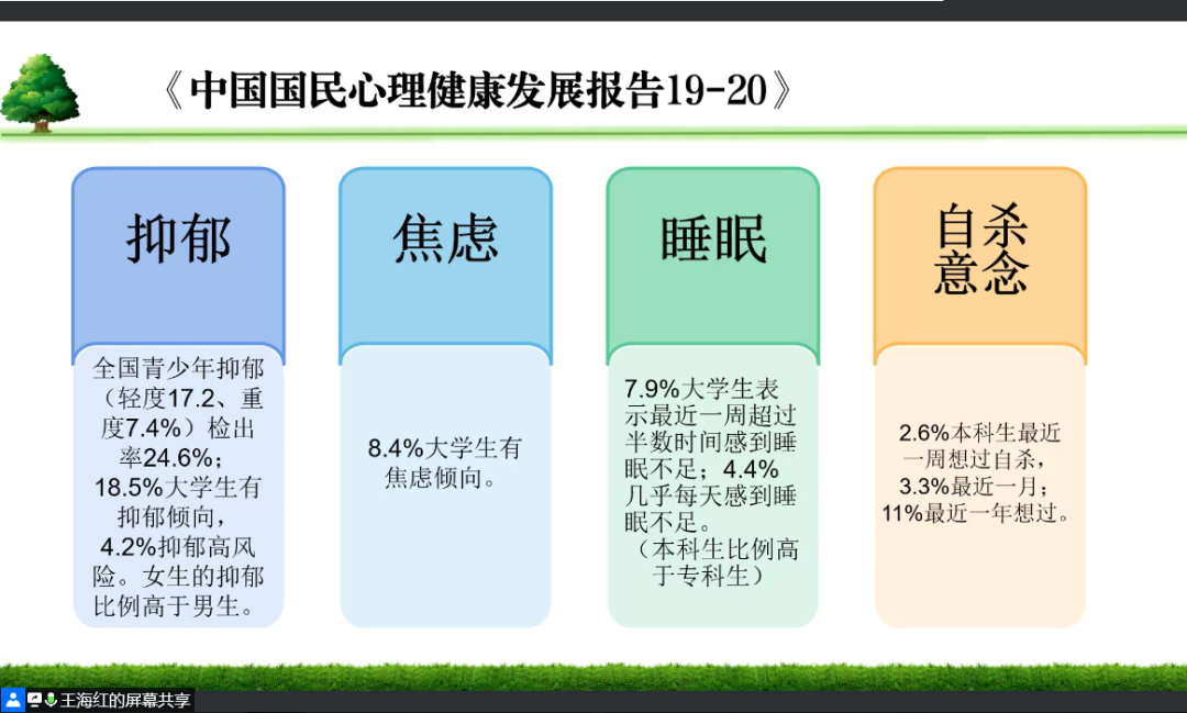 最后,王海红老师呼吁各位家长和学校共同保护大学生心理健康,强调家长对学生的巨大影响,希望每位家长能够重视学生学业,多关注学生心理,多和学生沟通,让每一位大学生能够积极、乐观、健康地度过四年大学生活。