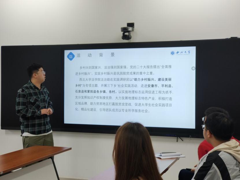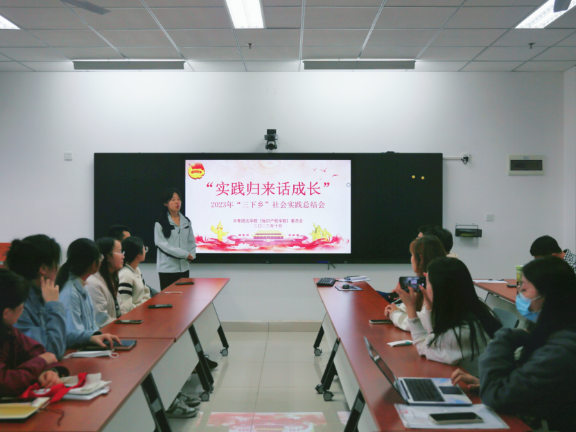 鲍亮同学介绍此次活动是调研团在党的二十大报告提出全面推进乡村振兴的背景之下,以助力乡村振兴,建设美丽乡村为主题开展的。活动旨在为各村镇营造遇事找法、自觉守法的浓厚法治氛围。七天的时间参观了茶叶公司、博物馆等,并前往政府、检察院进行学习调研。团队发放农业知识产权相关调查问卷,发现现存的问题,从而提出针对性的建议和解决措施。